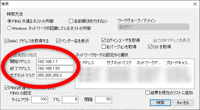 探索範囲とサブネットマスクを指定して探索を開始します。