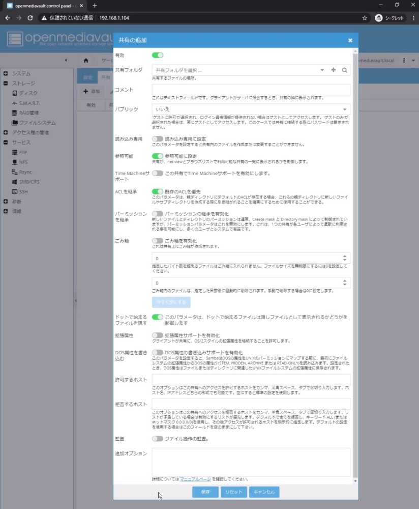 次にSMB/CIFSを有効にし、フォルダーを共有化する。です。